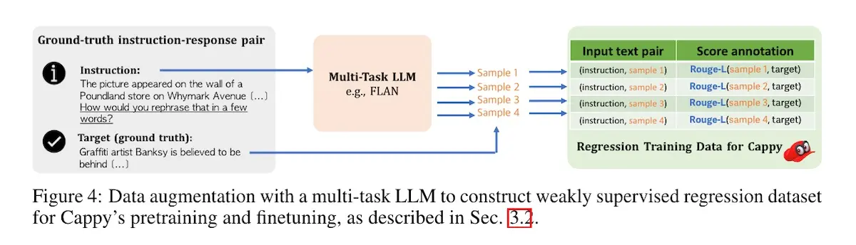 Cappy is trained on 39 diverse datasets from PromptSource which includes tasks such as question answering, sentiment analysis, summarization, etc. The instruction-response pairs from PromptSource are given a score of 1.0 while deliberately mismatched pairs are assigned a score of 0.0. To augment the data, bart0 and t0-3b were used to generate candidate responses and scores are assigned based on ROUGE-L. Overall, they collected a pretraining dataset of 160 million examples.