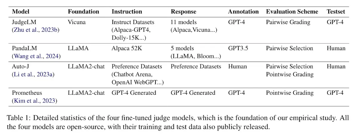 On the Limitations of Fine-tuned Judge Models for LLM Evaluation compares four finetuned LLM-evaluators (JudgeLM, PandaLM, Auto-J, and Prometheus) to gpt-4 across various benchmarks. These models were trained on their respective datasets such as dolly-15k, alpaca-52k, and gpt-4 synthetic data.