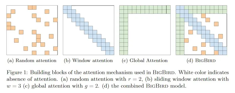Big Bird proposed generalized attention mechanism which has linear complexity (as opposed to quadratic) on the sequence length. It has three aspects of attention: