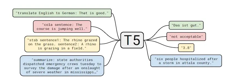 Translation, Q&A, classification are all text to text, with different prefixes to indicate the task (source)